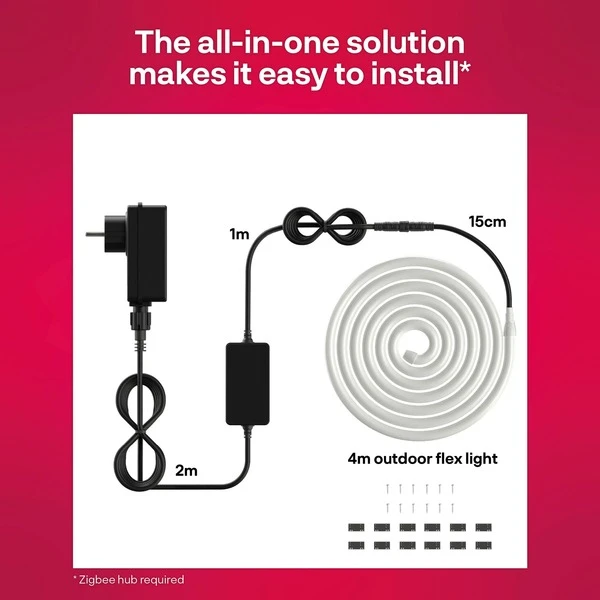 Das Outdoor Flex Light Colour von INNR bringt flexible, steuerbare Beleuchtung auf den Balkon, die Terrasse oder in den Garten. Dieser LED-Streifen erzeugt auf vier Metern Länge ein warm- bis kaltweißes oder bei Bedarf farbiges Licht mit bis zu 660 Lumen. Dabei kann er per App oder Sprachsteuerung gesteuert werden und lässt sich dank Zigbee-Protokoll in bereits bestehende Netzwerke integrieren. Art.-Nr.: 1848171