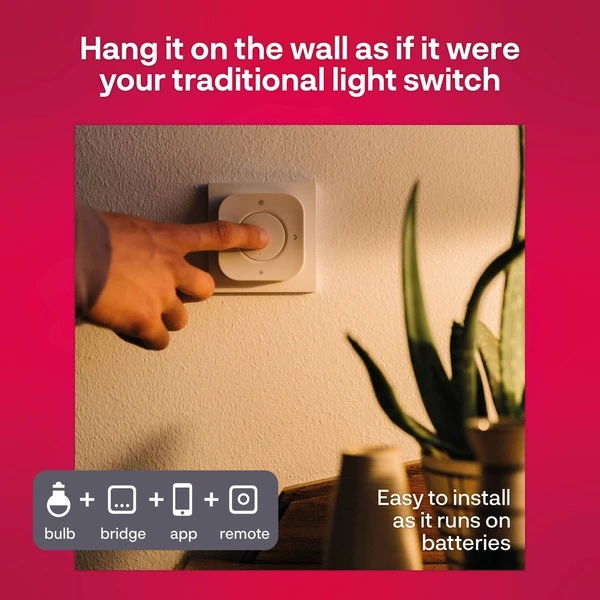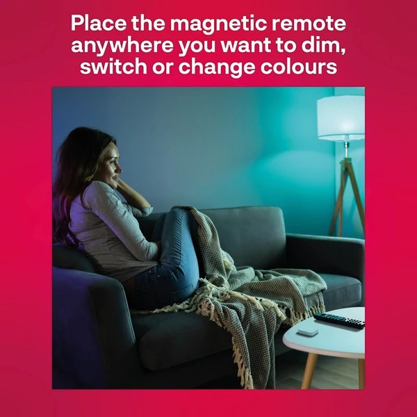 Mit der 5-Tasten-Fernbedienung wählt man, welche Lampen man steuern möchte – alle Leuchten in einem Raum oder eine ausgewählte Gruppe. Mit einem Tastendruck schalten sich die Lichter ein, aus, können abgedimmt oder aufgehellt werden oder zeigen eine bestimmte Lieblingsfarbe. In Kombination mit der Innr App kann man eigene Routinen voreinstellen und mit der 5-Tasten-Fernbedienung auswählen.Art.-Nr.: 1848173